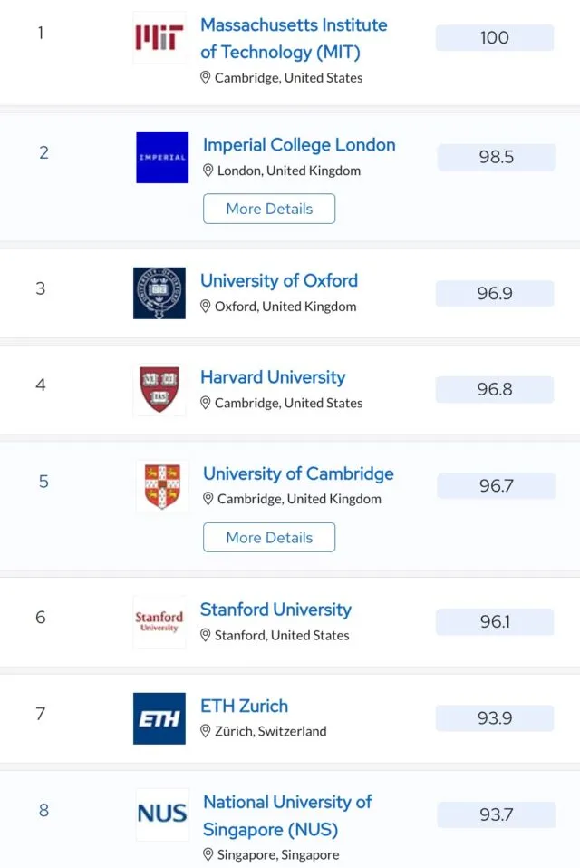 QS 톱 10에 MIT(1위), 스탠포드(3위), 하버드(4위), 캘리포니아 공과대(10위) 등 4개 대학이 포함되어 있으며, 톱 100에 약 27~30개 대학이 포함됩니다. 여전히 세계 대학 평가에서 절대 강자입니다.