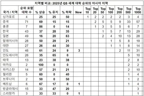 싱가포르의 NUS(8위), NTU(15위), 중국의 북경대, 청화대, 복단대가 높은 순위를 차지하고 있습니다. 한국은 서울대(31위), 연세대(50위)가 아시아 상위권입니다.