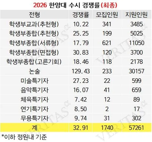 2026학년도 한양대 논술전형 모집인원: 총 474명