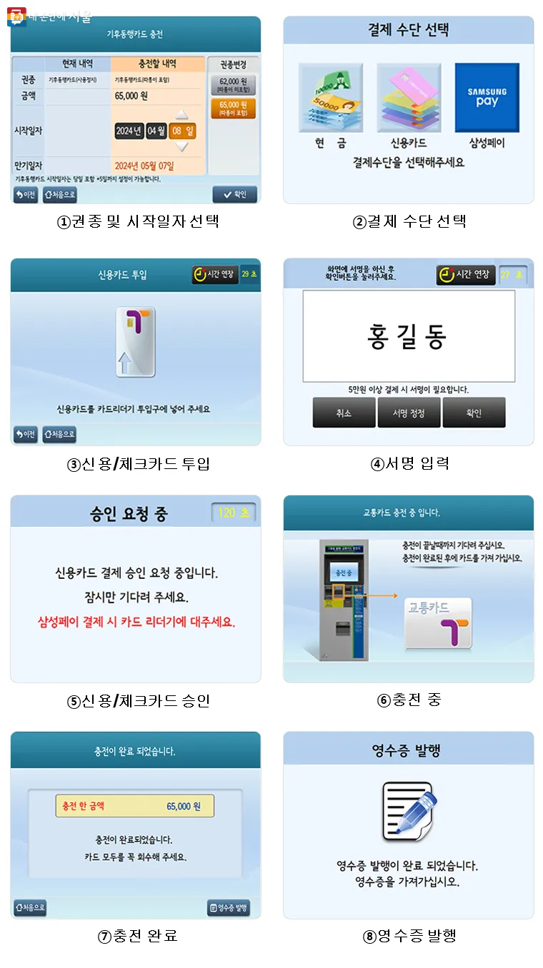 원하는 권종 선택(버스·지하철 62,000원 또는 청년 55,000원) 후 결제 - ⑤ 사용 시작